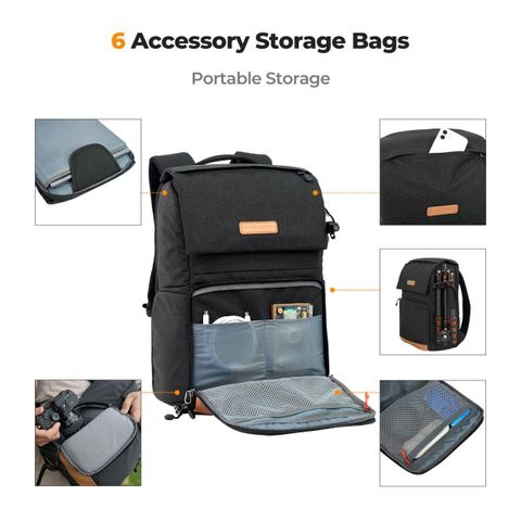 * 【Sức chứa lớn】11,4 x 7 x 17,5 inch, xấp xỉ 22L; Ngăn chính chứa 1 máy ảnh + 4 ống kính + chân máy + các phụ kiện chụp ảnh khác hoặc để lưu trữ DJI Mavic Drone (Mavic 2/Air/Pro); Ngăn trên được tối ưu hóa để cất giữ và bảo vệ các vật dụng cá nhân (như quần áo, ví, điện thoại di động hoặc ổ đĩa flash); Chân máy có thể được cố định vào túi dưới cùng và túi bên hông: Phiên bản này bao gồm một ngăn đựng máy tính xách tay độc lập cho máy tính xách tay lên đến 15,6 inch.