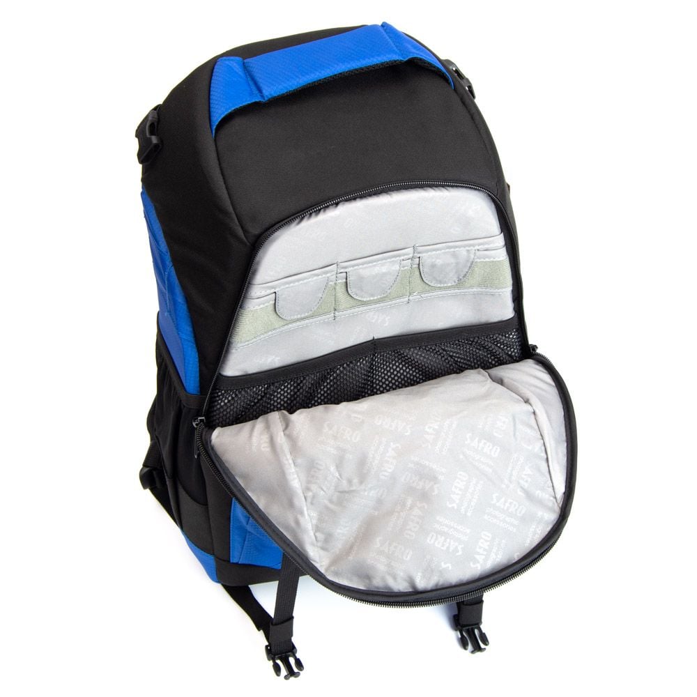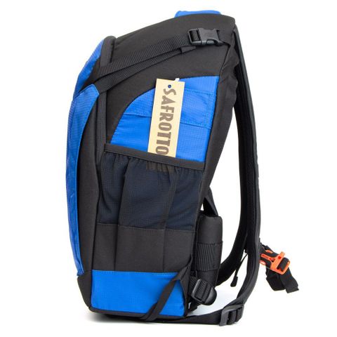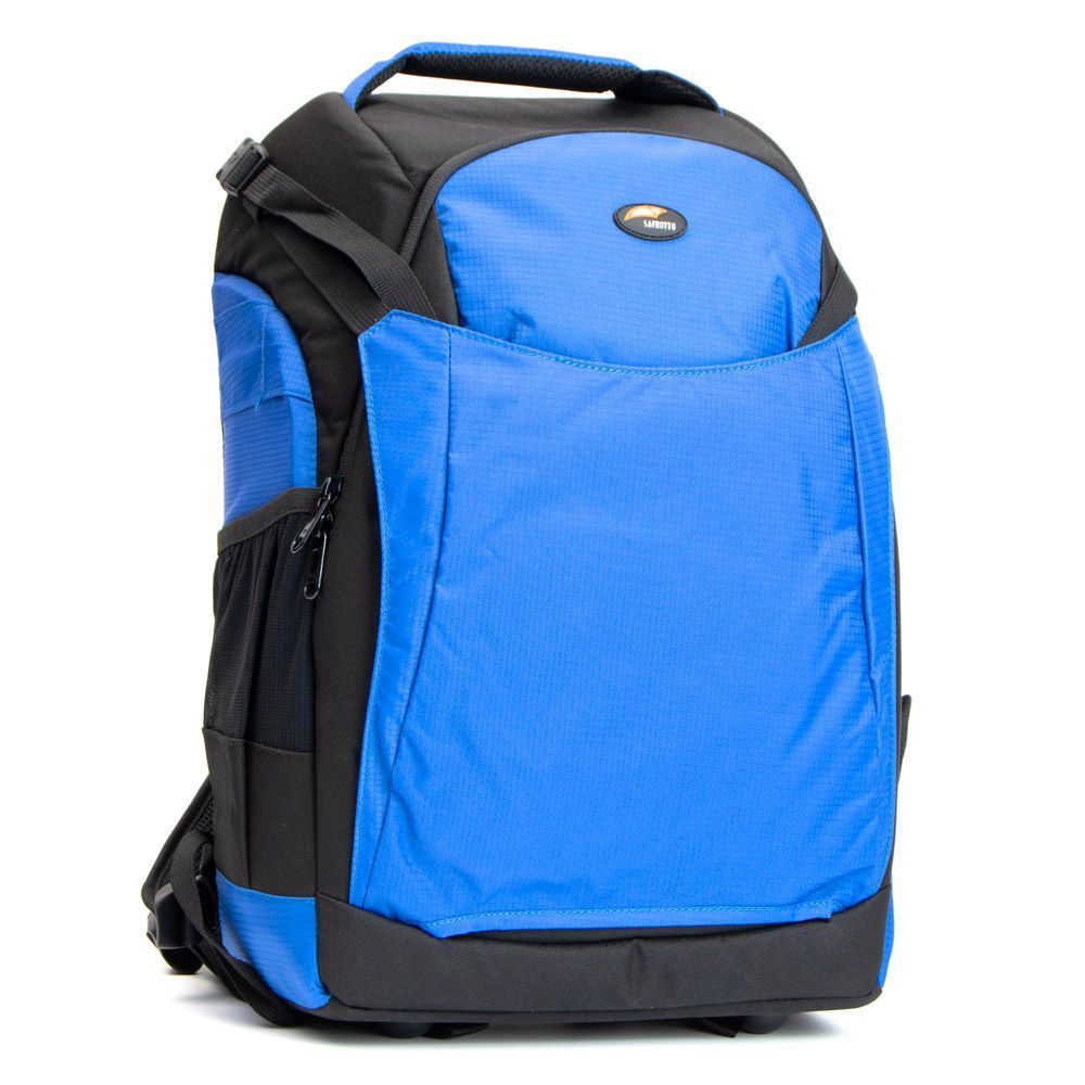 Balo nhỏ gọn màu xanh dành cho thiết bị chụp ảnh Safrotto MG-1 được làm bằng vải nylon chống thấm nước và chống mài mòn chất lượng cao. Các ngăn chia bên trong dạng trượt, dây đai để cố định và lớp lót mềm giúp bảo vệ thiết bị. Trọng lượng của ba lô là 1,5 kg. Kích thước bên ngoài - 28 x 14 x 46 cm (dài, rộng, cao). Mặt trước có logo Safrotto bằng cao su và một túi mở để đựng đồ dùng cá nhân. Đáy ba lô được trang bị chân cao su để bảo vệ đáy.