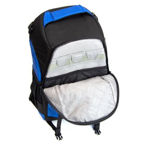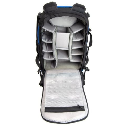 Ngăn chính được thiết kế để đựng thiết bị chụp ảnh hoặc quay phim, rộng rãi và được chia thành nhiều ngăn bằng vách ngăn mềm. Có thể cố định các vách ngăn theo ý muốn. Ngăn chứa có thể chứa hai máy ảnh SLR và 3-4 ống kính. Có thể để máy tính bảng hoặc các phụ kiện khác vào túi lưới ở thành phía trước. Hai bên hông ba lô có các túi chun, ví dụ để đựng bình nước hoặc chân máy. Chân máy được cố định bằng dây đai và chốt.