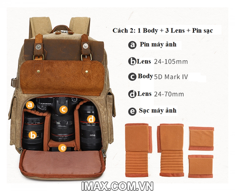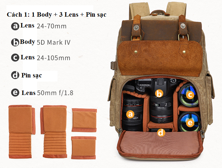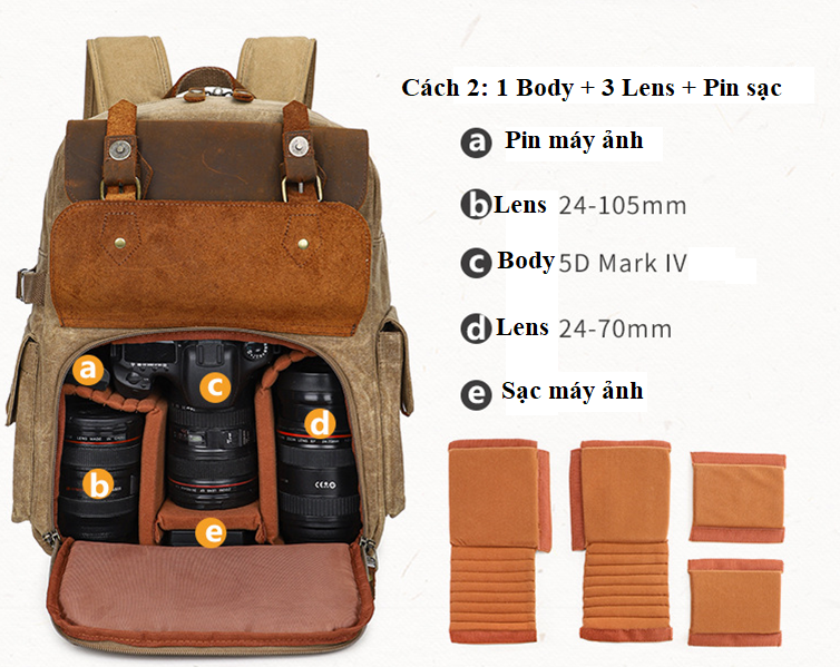 Thuộc dòng balo HalfPhoto, nửa trên để đồ cá nhân, nửa dưới để 2 body kèm 3-4 lens.