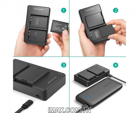 Dung lượng pin thay thế là 1000 mAh bạn có thể thoải mái chụp lên đến890 ảnh. Bộ sạc kép có thể sạc cùng lúc hai pin chỉ trong 3 giờ qua cổng micro-USB 5V/2A.