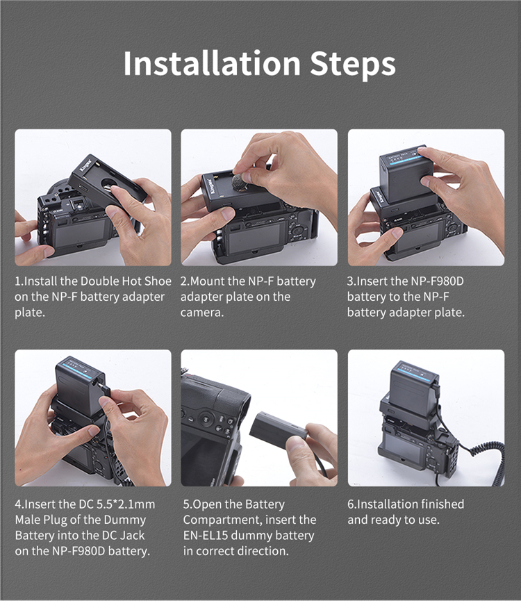 Thông số kỹ thuật: - Thương hiệu: Kingma Hình ảnh sản phẩm: Bộ Giả Pin/ Pin ảo Dummy Battery Sony DR-EN-EL15 và Đế pin Kingma BM-F980D