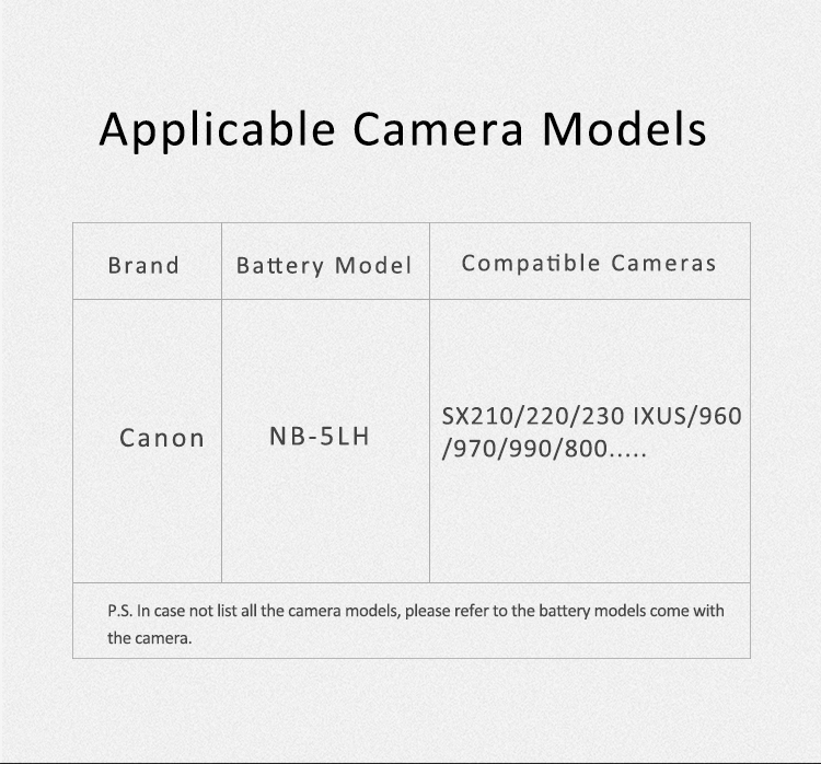 • Canon PowerShot SX200 IS | SX210 IS | SX220 HS | SX230 HS | SX240 HS | SX260 HS | SX270 HS | SX280 HS | SX500 IS | SX510 HS | SX600 HS | SX700 HS | SX710 HS | SD700 IS | SD790 IS | SD800 IS | SD850 IS | SD870 IS | SD880 IS | SD890 IS | SD900 Ti | SD950 IS | SD970 IS | SD990 IS