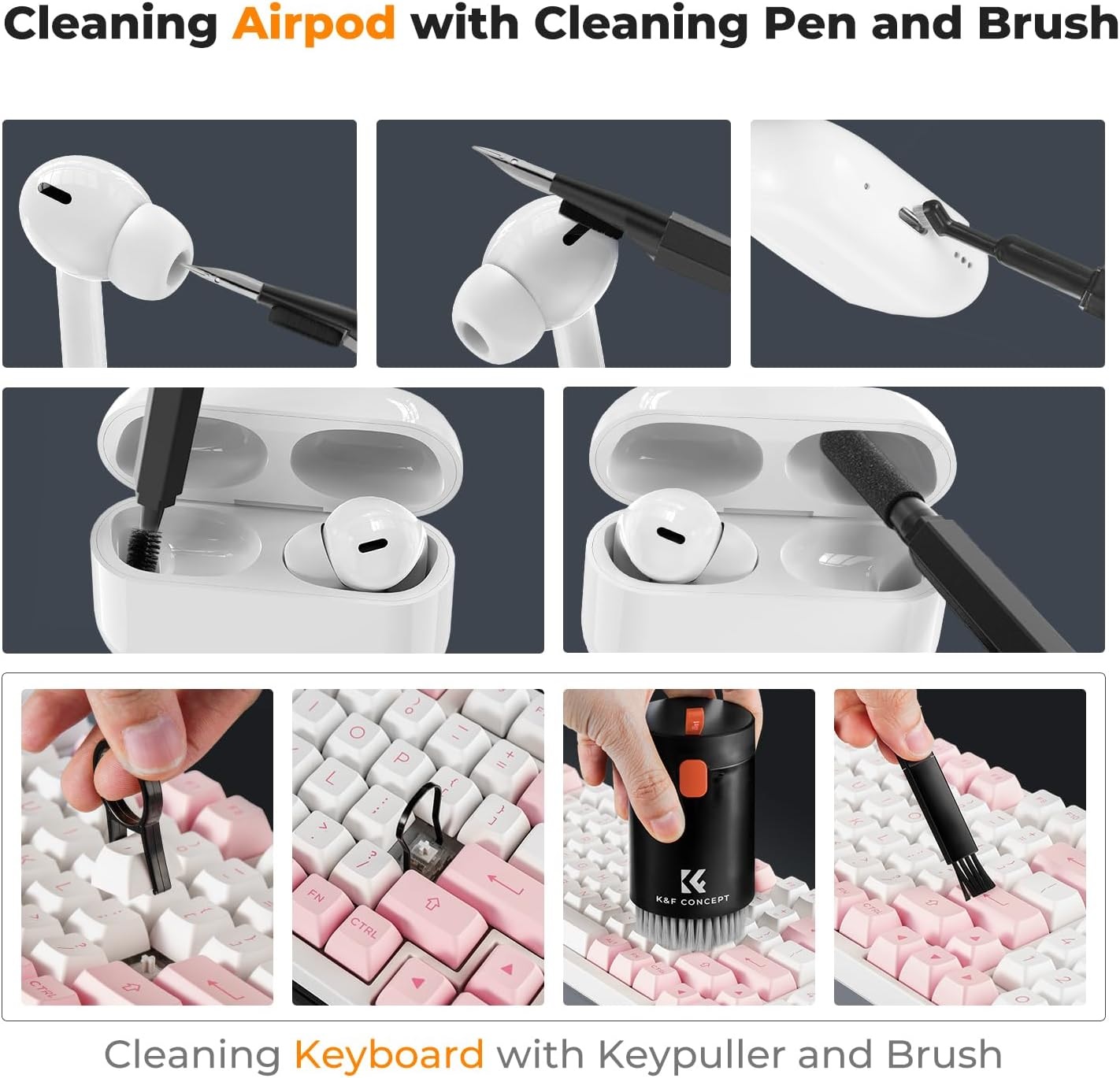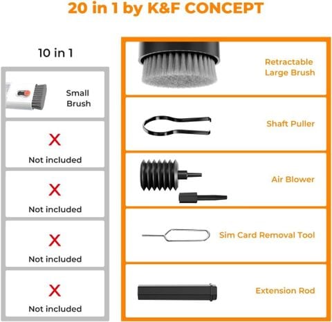 🎁 Bộ vệ sinh bàn phím 20 trong 1: Bộ vệ sinh máy tính bao gồm bút vệ sinh Airpod, miếng bọt biển nhung, bàn chải mềm nhỏ, bàn chải len, bàn chải vệ sinh hộp đựng tai nghe và bàn chải camera (❗Tất cả các bàn chải này đều có thanh nối dài có thể sử dụng dễ dàng hơn❗), bình xịt vệ sinh màn hình, khăn lau sợi nhỏ, bàn chải bàn phím có thể thu vào, dụng cụ tháo nắp phím, dụng cụ tháo trục, máy thổi khí có 2 thanh để kéo dài, bàn chải hai đầu, chốt lấy thẻ.