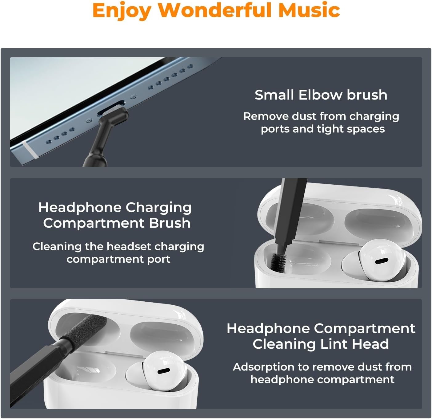 🎶Tận hưởng âm nhạc tuyệt vời: Bộ vệ sinh Airpod có thể làm sạch hoàn toàn tai nghe và hộp sạc của bạn. Đầu kim loại làm sạch bụi bẩn cứng đầu ẩn sâu trong các khe hở; Bàn chải lông mềm làm sạch bụi bám trên lưới cách âm, các lỗ nông và khe nứt; Bàn chải mềm và bàn chải cứng làm sạch bụi bẩn ẩn sâu trong các lỗ sâu, mang đến cho bạn trải nghiệm âm nhạc tốt hơn.