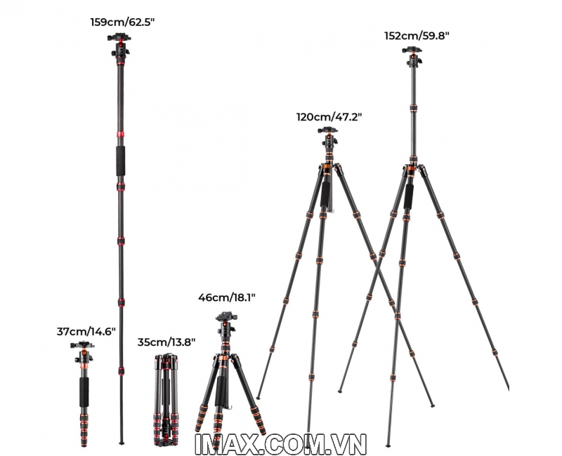 - Chiều cao làm việc của chân máy từ 18 inch/46cm đến 60 inch/152cm