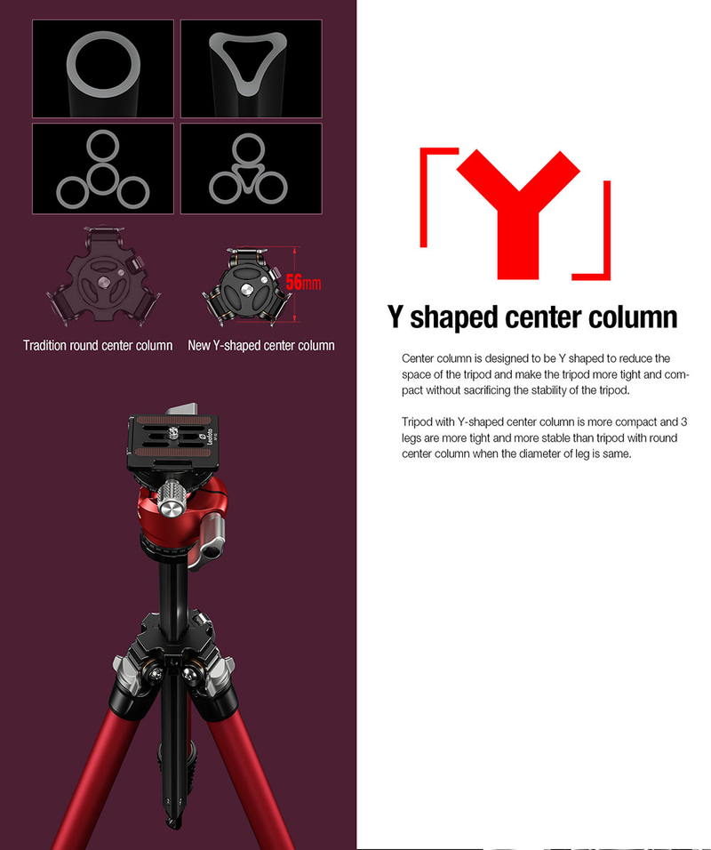 Khác với trụ giữa hình tròn truyền thống, trụ giữa hình chữ Y cho phép các chân tripod gần nhau hơn khi gập lại, giảm đường kính của tripod khi gấp gọnmà vẫn giữ được tính ổn định và tính năng chụp ảnh. Với chiều cao tối đa 1410 mm và chiều dài khi gập là 480 mm, Mr. Y có thể thoải mái mang theo trong những chuyến đi.