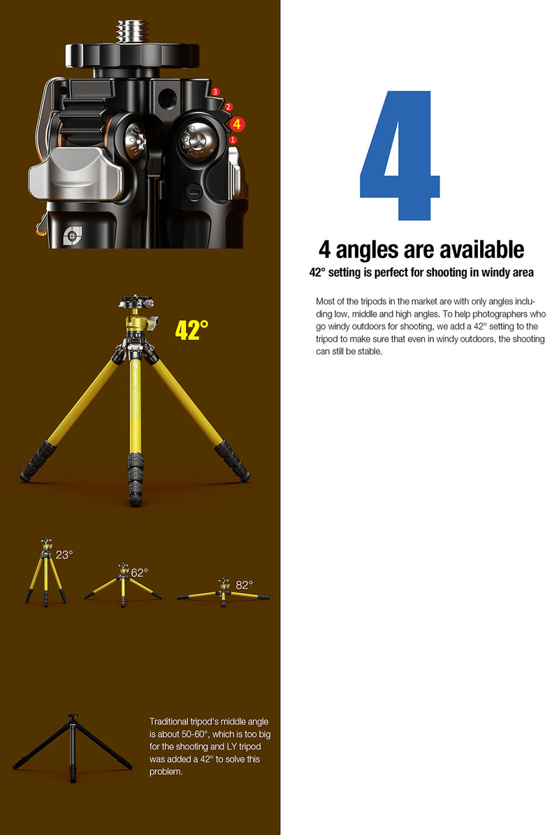 Hầu hết các chân máy trên thị trường chỉ có các góc thấp, trung bình và cao. Để giúp các nhiếp ảnh gia chụp ảnh ngoài trời với khu vực gió mạnh, chúng tôi đã thêm một góc 42° vào chân máy để đảm bảo rằng ngay cả trong điều kiện gió mạnh, việc chụp ảnh vẫn được ổn định.