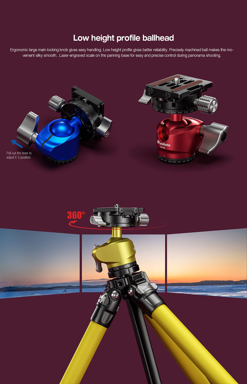 Núm khóa chính lớn với thiết kế công thái học mang lại cảm giác điều chỉnh dễ dàng. Thiết kế chiều cao thấp giúp tăng tính ổn định. Bi cầu được gia công chính xác mang lại chuyển động trơn tru. Thước khắc laser trên mặt đế xoay điều khiển dễ dàng và chính xác trong quá trình chụp panorama.