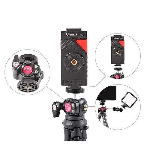 - Kẹp điện thoại đi kèm tương thích với các dòng điện thoại có kích thước ngang 56-86mm, điều chỉnh bằng nút bấm, thiết kế răng cưa một chiều giúp ổn định và chắc chắn hơn. Ngoài ra, còn tích hợp cold shoe và 2 lỗ vít 1/4" mở rộng cho phép gắn thêm được nhiều phụ kiện hơn.