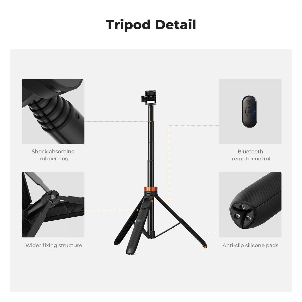 * Có thể điều chỉnh độ cao: Chân đế này có 8 ống có thể điều chỉnh và kéo dài từ 33cm/13'' đến 175cm/69''. Các ống được làm bằng hợp kim nhôm chất lượng cao, chịu tải tối đa 2kg, chắc chắn và bền bỉ, đáp ứng hầu hết các nhu cầu chụp ảnh và selfie.