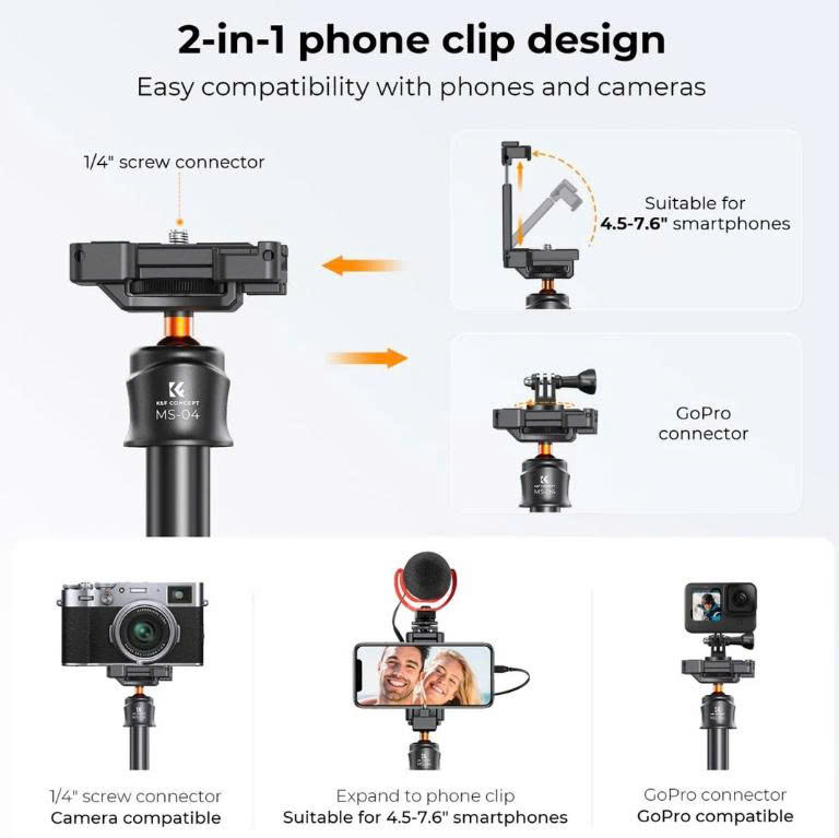 - Kết nối : Ren tiêu chuẩn 1/4 inch-20, kẹp điện thoại tích hợp (phù hợp với điện thoại rộng 5.6-9.5cm), và adapter GoPro đi kèm