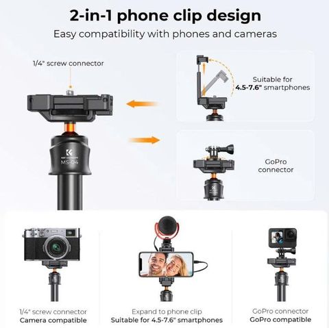 Gậy K&F Concept MS08 - KF09.127v1 là một phụ kiện đa năng 2 trong 1, vừa là tripod (chân máy ảnh) có thể kéo dài chiều cao, vừa là gậy selfie tiện dụng, tương thích với nhiều loại thiết bị từ điện thoại đến máy ảnh mirrorless