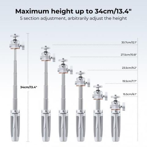 - Tương thích rộng rãi: Hỗ trợ tải trọng lên đến 2 kg và có ren 1/4 inch tiêu chuẩn, tương thích với hầu hết các máy ảnh mirrorless nhỏ gọn, điện thoại thông minh (4.4-7.2 inch), và action camera.