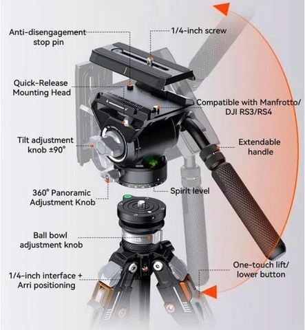 - Giao diện: Tích hợp bát cân bằng (leveling bowl), cho phép cân chỉnh mặt phẳng ngang một cách nhanh chóng và chính xác cho công việc quay phim.