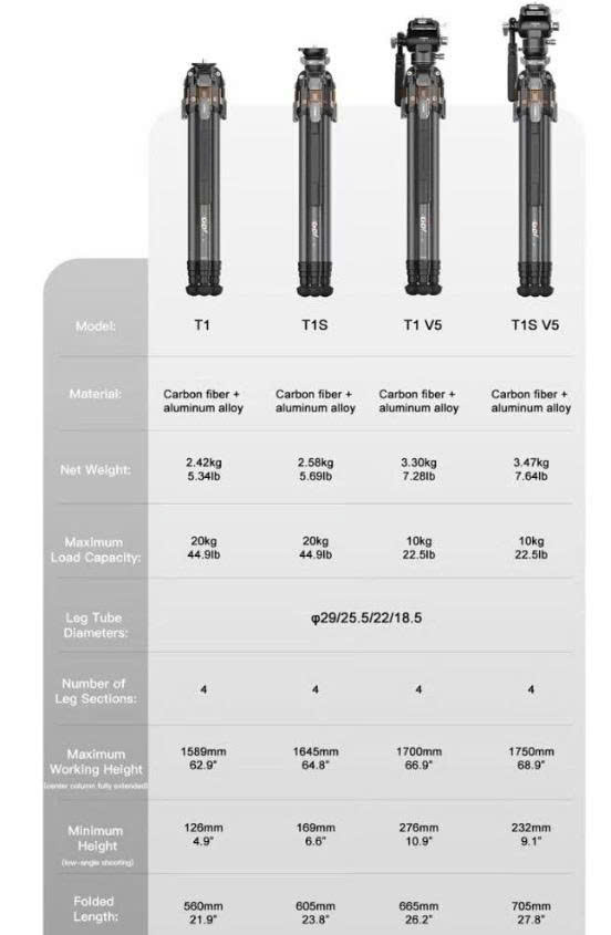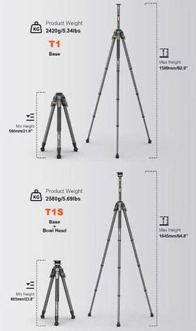 - Chân máy T1S: Chân máy sợi carbon nhẹ với hệ thống "Snap-Open" tức thì, cho phép thiết lập độ cao trong vài giây.