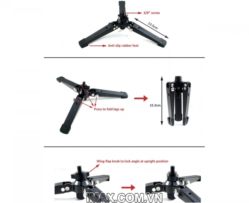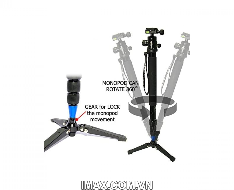 - Cho phép chuyển động nghiêng với núm vặn trên cánh để khóa chân máy đơn ở vị trí thẳng đứng.