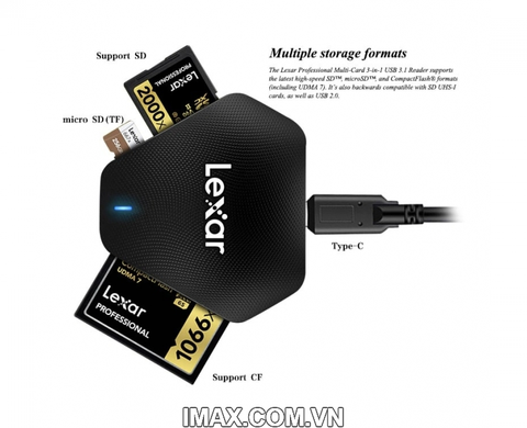 Đầu đọc USB 3.1 đa thẻ 3 trong 1 Lexar Professional hỗ trợ các định dạng SD ™, microSD ™ và CompactFlash®(bao gồm cả UDMA 7) tốc độ cao mới nhất.Nó cũng tương thích ngược với thẻ SD UHS-I, cũng như USB 2.0.