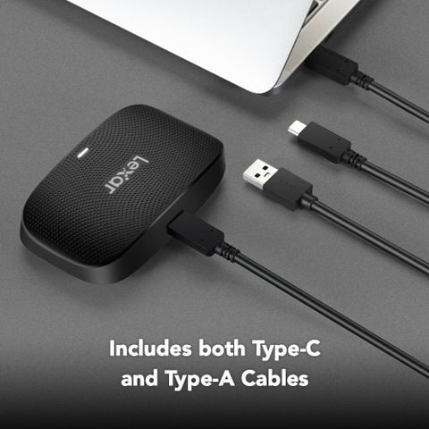 Với cả cáp USB Type-C đến Type-C và cáp USB Type-A đến Type-C đi kèm, đầu đọc có thể sử dụng ngay khi lấy ra khỏi hộp mà không cần thêm bất kỳ thiết bị ngoại vi nào.