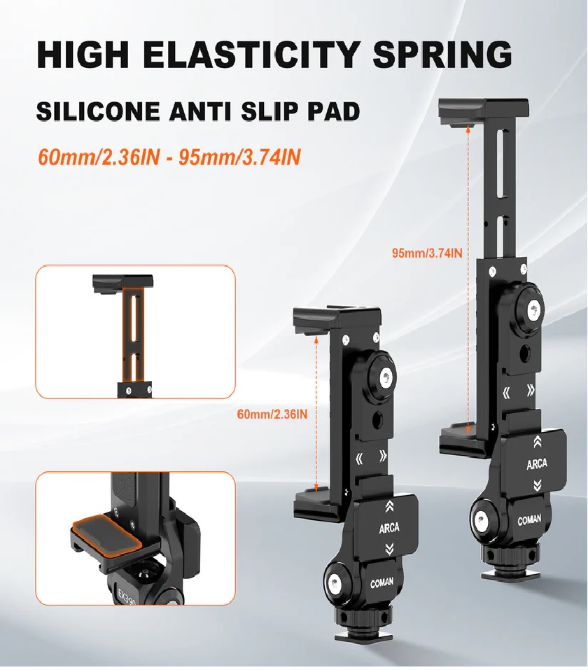 【Điều chỉnh linh hoạt 360°】 Đệm cao su silicon chống trượt lò xo đàn hồi cao, có chiều dài co giãn từ 60mm đến 90mm, có thể xoay điện thoại từ 180° đến 360° và xoay giữa các vị trí dọc và ngang. Đi kèm với núm điều chỉnh tinh tế để điều chỉnh góc nghiêng chính xác.