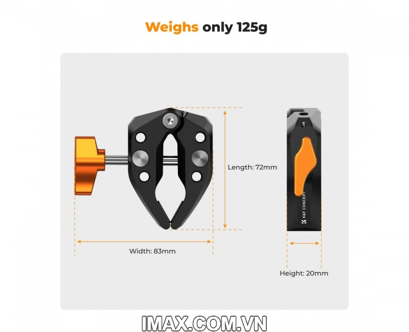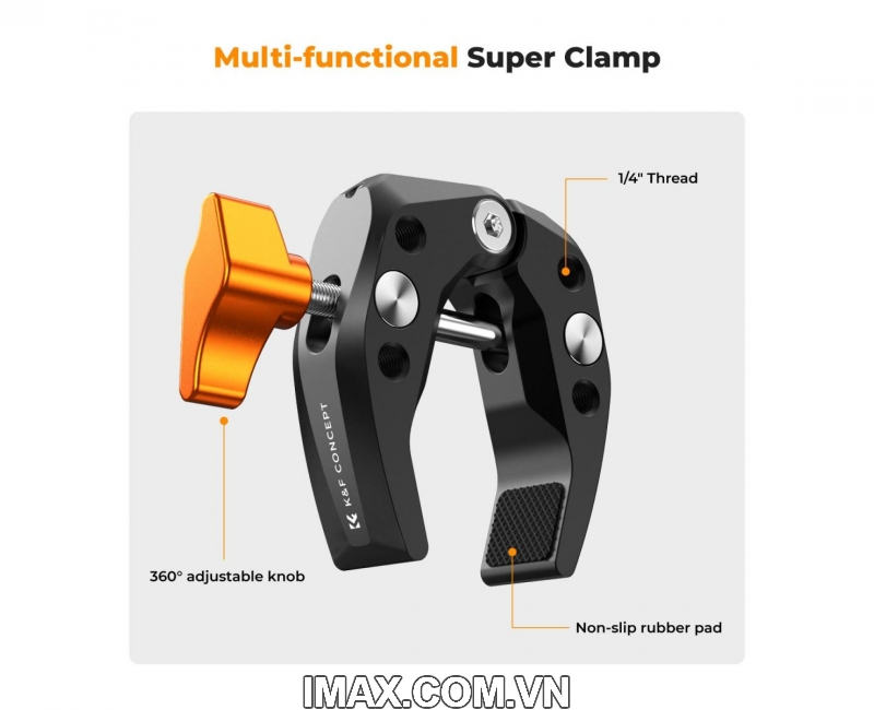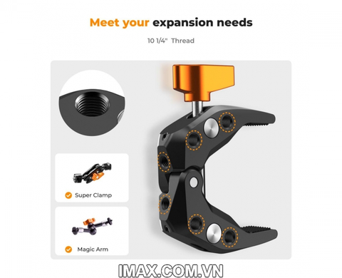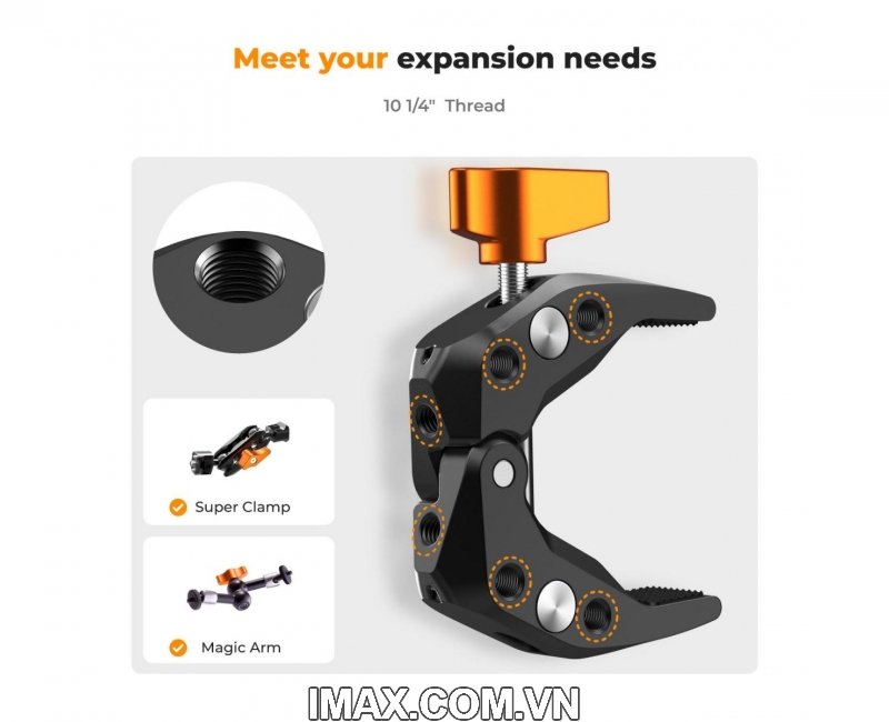 - Kẹp có số lượng lớn các lỗ vít 1/4" được thiết kế để tạo điều kiện sử dụng với nhiều bộ chuyển đổi