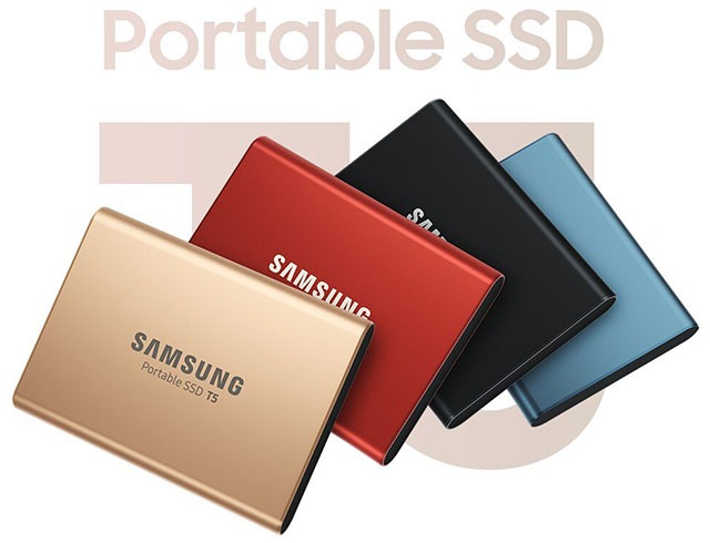 Được thiết kế full kim loại từ trên xuống dưới và kiểu dáng Unibody được bo tròn viền xung quanh với kích thước chỉ bằng lòng bàn tay của bạn. Ổ cứng di động SSD Samsung Porp T5 có nhiều màu sắc khác nhau như màu xanh nước biển(blue), màu đen, màu vàng (gold), màu đỏ tùy theo các phiên bản dung lượng 250GB, 500GB, 1TB, 2TB như hình dưới.