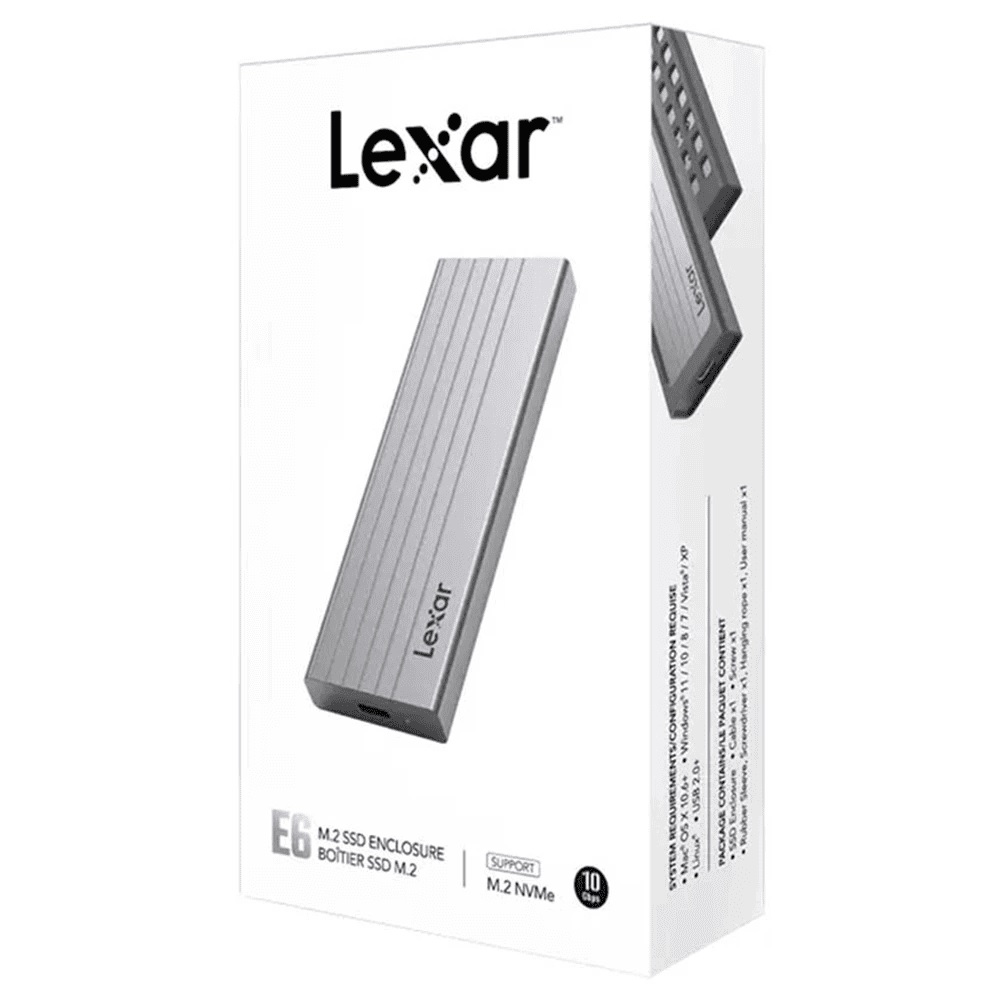 SSD Box Lexar E6 hỗ trợ giao thức NVMe, tương thích với giao diện M và B&M và hỗ trợ dung lượng tối đa 2TB. Thông qua giao diện tốc độ cao USB 3.2 Gen 2, với tốc độ truyền lên tới 10Gbps.