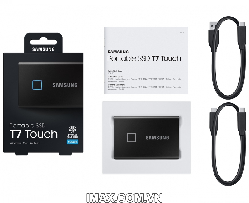 Ổcứng di động SSD Samsung Porp T7 truy cập tập tin của bạn mọi lúc, mọi nơi. T7 Touch tương thích với PC, Mac, thiết bị Android, máy chơi game, v.v. Bao gồm trong hộp là cáp USB loại C-to-C và loại C-to-A để thêm phần thuận tiện.