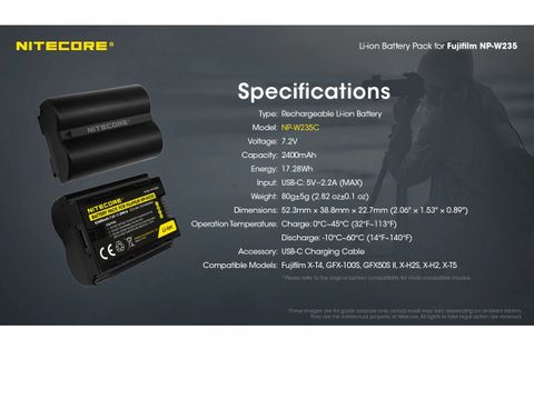 Pin Nitecore NP-W235C là nguồn năng lượng đáng tin cậy cho máy ảnh Fujifilm, với dung lượng 2400mAh. Tương thích với nhiều dòng máy Sony hàng đầu như Fujifilm X-T4, GFX-100S, GFX50SⅡ, X-H2S, X-H2, X-T5. Pin có thể sạc lại qua cổng USB-C, mang lại sự thuận tiện và linh hoạt cho người sử dụng chuyên nghiệp và nghiệp dư. Đừng bỏ lỡ khoảnh khắc quan trọng với hiệu suất ổn định và độ tin cậy của pin NP-W235C.