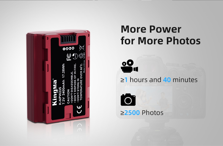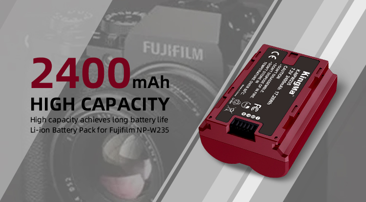 Dung lượng: 2400mAh (17.28Wh). Đây là mức dung lượng lớn nhất hiện nay cho hệ pin W235, cao hơn cả pin zin Fujifilm (2200mAh) và phiên bản KingMa cũ (1960mAh).