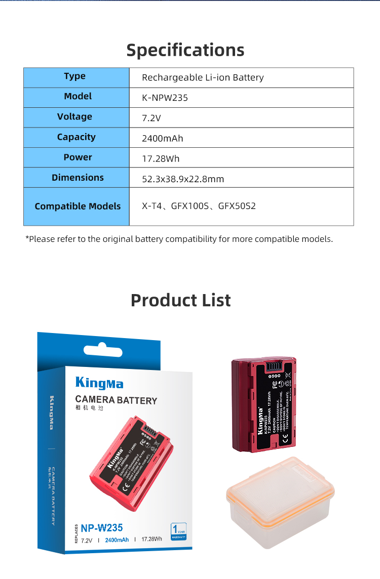 1. Pin Kingma for Fujifilm NP-W235 2400mAh :