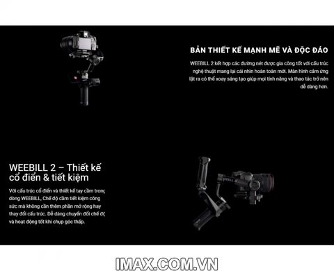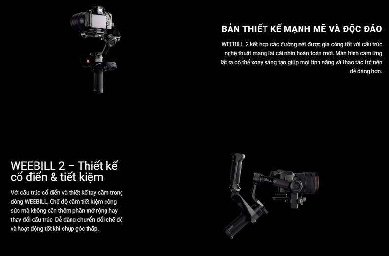 Gimbal Zhiyun-Tech Weebill 2 dễ dàng xử lý cân những Combo máy ảnh và ống kính DSLR, máy Mirrorless. Nhờ thiết kế gọn gàng và nhiều chế độ chỉnh thông số máy ảnh ngay trên Gimbal giúp cho Weebill 2 mang đến cho người dùng dễ dàng hơn bao giờ hết. Các khớp nối được thiết kế chắc chắn hơn dòng Weebill Lab trước đó đã giúp cho dòng Weebill 2 trở nên chắc chắn hơn, hệ thống ViaTouch 2.0 thông minh cũng như Modul truyền hình ảnh HD qua Smartphone độ trễ cực thấp.