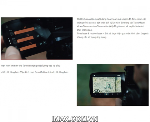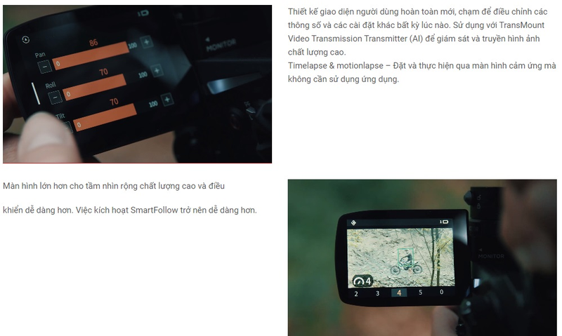 Màn hình màu cảm ứng xoay lật cho người dùng có thể dễ dàng theo dõi và điều chỉnh các thông số của Gimbal và máy ảnh khi cần thiết.