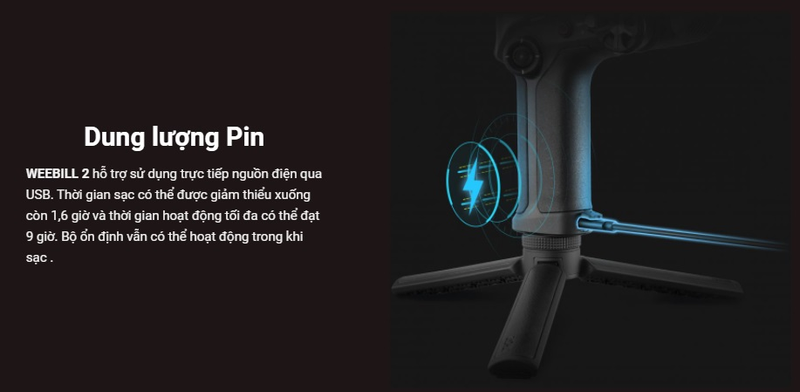 Một nâng cấp đáng giá khác của WEEBILL 2 chính là thời lượng sử dụng. Chiếc Gimbal này được tích hợp sẵn ba viên pin 18650 bên trong (có thể tháo rời), mỗi viên có dung lượng 2600mAh. Trong một lần sạc đầy, 3 viên pin này cung cấp thời gian sử dụng lên tới 9 tiếng.