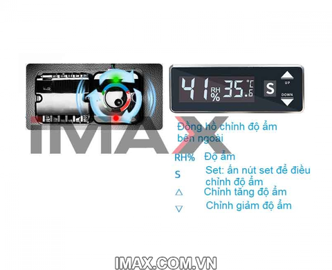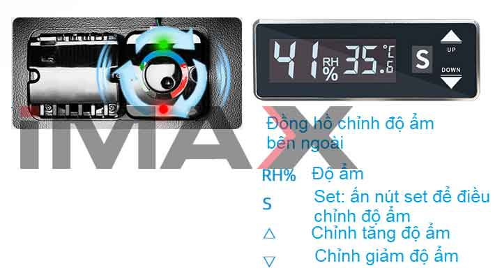 : Gồm 1 đồng hồ số (digital) gắn phía trên tủ báo độ ẩm & các phím điều chỉnh độ ẩm bên trong tủ