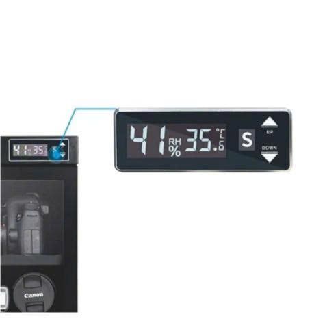 - Cắm dây điện vào ổ, quan sát màn hình LCD hiển thị độ ẩm và nhiệt độ trong tủ, và tùy chỉnh độ ẩm theo từng dòng máy, từng đồ dùng hoặc thiết bị