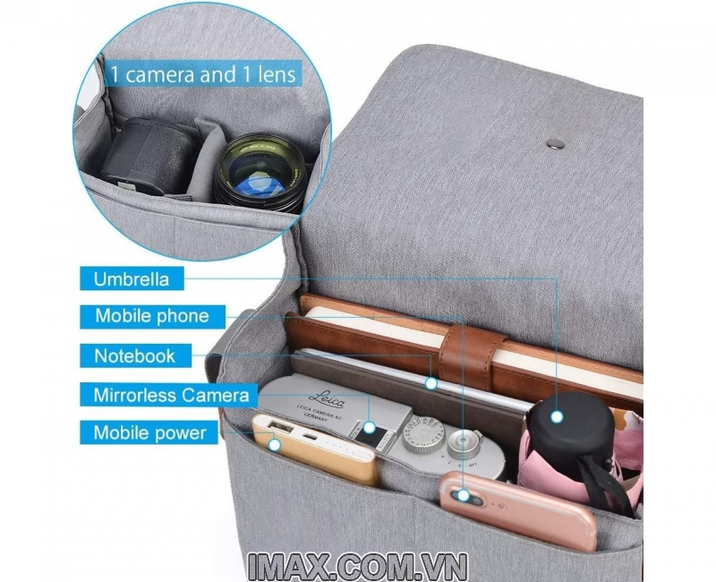 - Phù hợp với 1 máy ảnh + 1 ống kính dự phòng + điện thoại di động + phụ kiện.