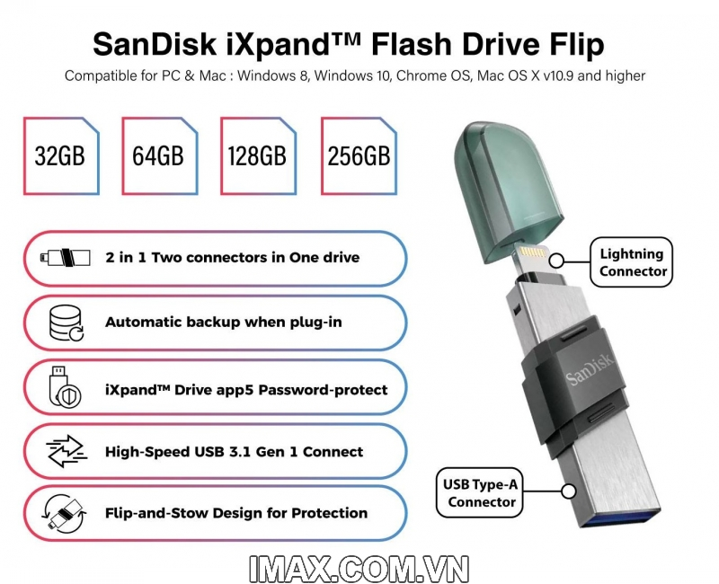 Giải phóng không gian lưu trữ trên iPhone hoặc iPad của bạn một cách nhanh chóng và dễ dàng với USB OTG Sandisk iXpand.USB OTG Sandisk iXpand dễ dàng sử dụng và kết nối cực nhanh cho phép bạn dễ dàng di chuyển hình ảnh, video, và các tập tin khác. Bạn cũng có thể di chuyển các tập tin này vào một máy PC hoặc Mac.