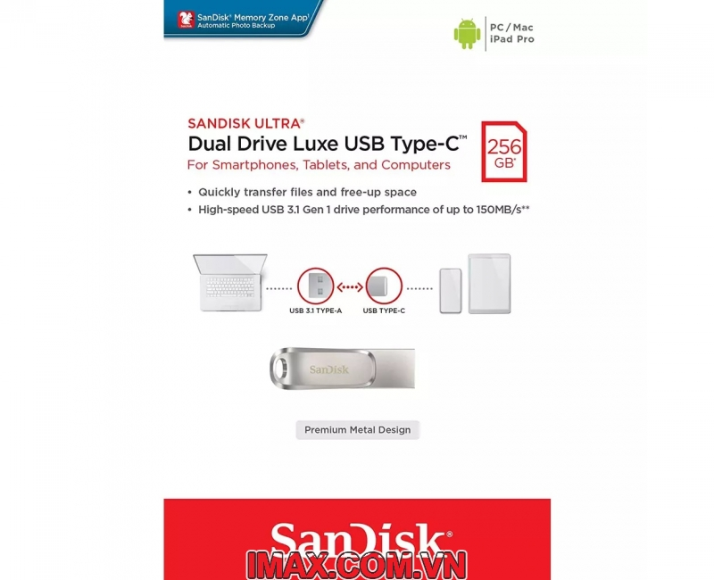 Với chuẩn giao tiếp USB 3.1 tốc độ siêu cao lên đến 150 MB/s, giúp bạn giải phóng không gian lưu trữ trên điện thoại của bạn hoặc di chuyển nội dung giữa các thiết bị di động có trang bị giao tiếp chuẩn USB Type-C. Ngoài ra, USB OTG Type-C SanDisk Ultra Dual Drive Luxe có thêm một đầu kết nối USB Type A truyền thống, cho phép bạn dễ dàng chuyển các tập tin giữa điện thoại thông minh, máy tính bảng và máy tính. Ứng dụng đi kèm "SanDisk Memory Zone" trên Android (có sẵn trên Google Play) giúp bạn quản lý vào sao lưu tập tin dễ dàng hơn. Tất cả các sản phẩm của SanDisk được sản xuất với tiêu chuẩn cao nhất và thử nghiệm chặt chẽ. Bạn có thể tự tin vào chất lượng, hiệu suất vượt trội và độ tin cậy của tất cả các sản phẩm SanDisk.